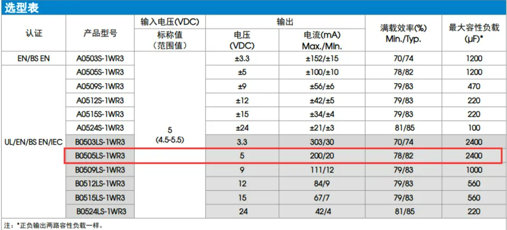 电源部分用了金升阳的隔离电源模块B0505LS-1WR3,最大输出功率1W,满载效率80%左右,输出最小电流为20mA。