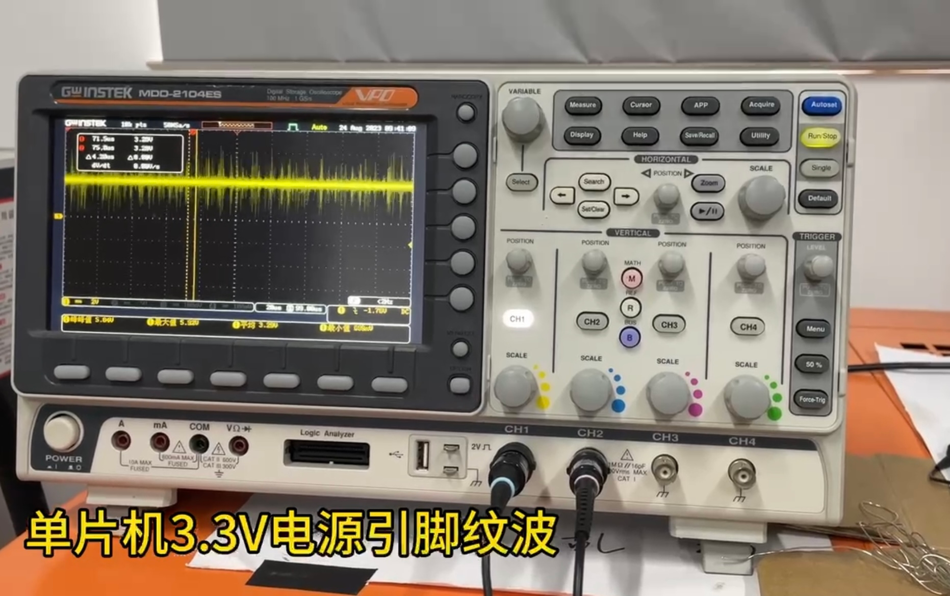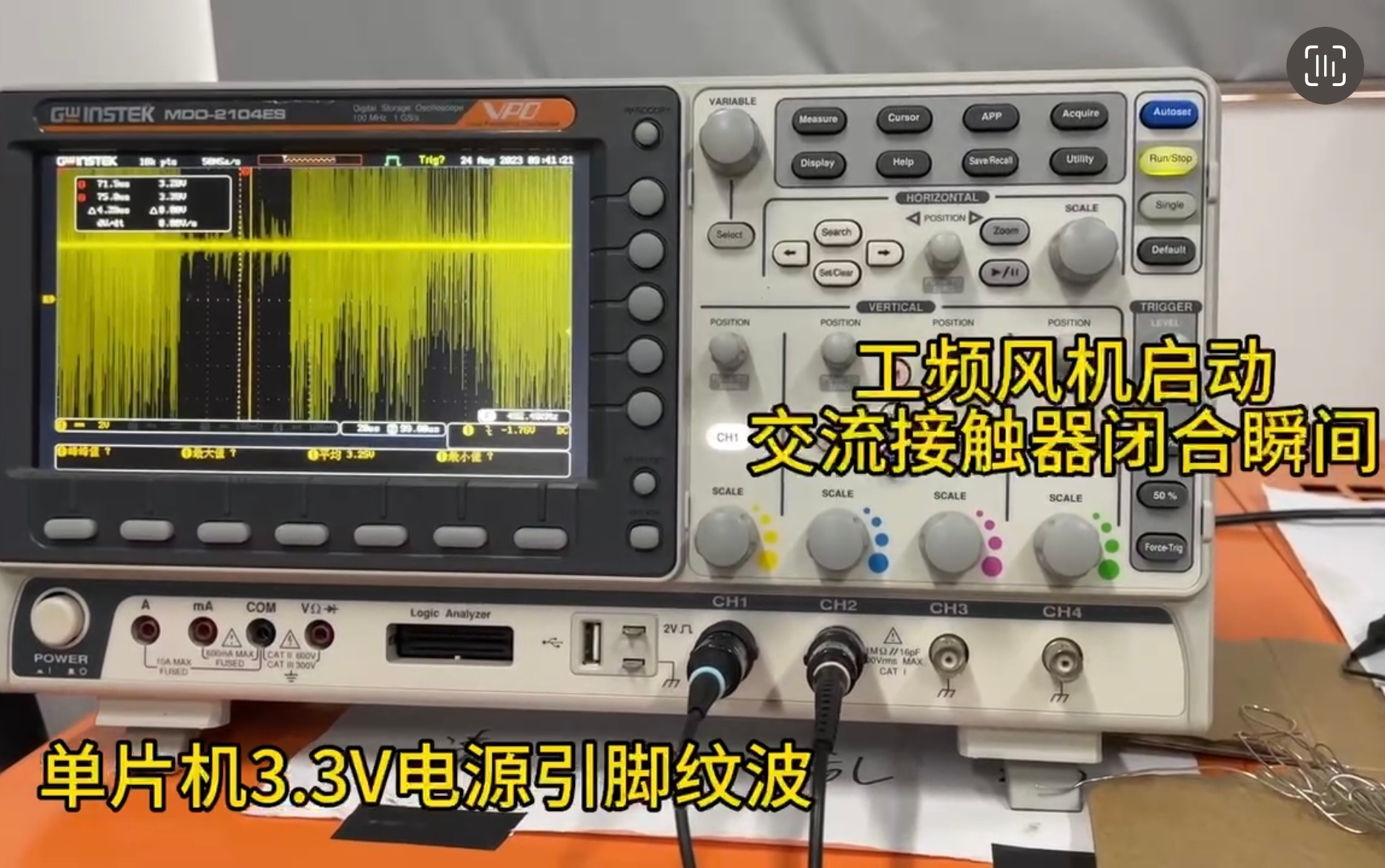 我们重新检测这台运行了“很久”的设备的各个电源回路,发现当设备运行了一段时间之后,3.3V 的电源回路上就会出现一些噪声,纹波忽高忽低,特别是在电机启动或者电磁阀吸合瞬间,电源噪声可能达到 2~3V 以上。(不是每次噪声都会导致MCU复位,说明这款MCU还是挺“扛噪”的。)