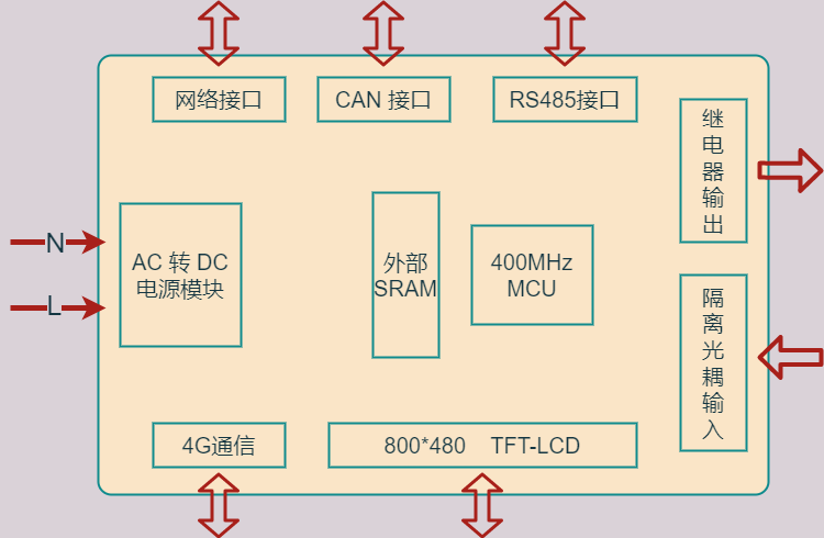 现场出现问题的是一款工业三相电机控制器设备,采用 AC-220V 供电,里面有 AC 转 DC 电源模块,带有显示屏和联网功能,支持继电器输出和隔离光耦输入,支持 RS485 和 CAN 通信功能,设计框图如下。