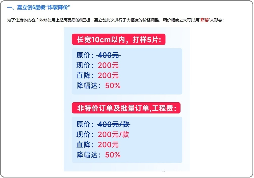 以前打个 6 层板的样品,打样费也是一笔不小的研发成本开销,现在嘉立创对于 6 层以上 PCB 的打样政策,工程费可以大降50%,对不少中小企业是非常大的利好。