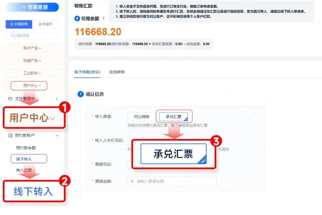 第二步 在嘉立创下单系统中,依次选择【用户中心】→【线下转入】→【承兑汇票】,输入“转入人手机号码、票据号码及票据金额”等相关转账信息。步骤如图: