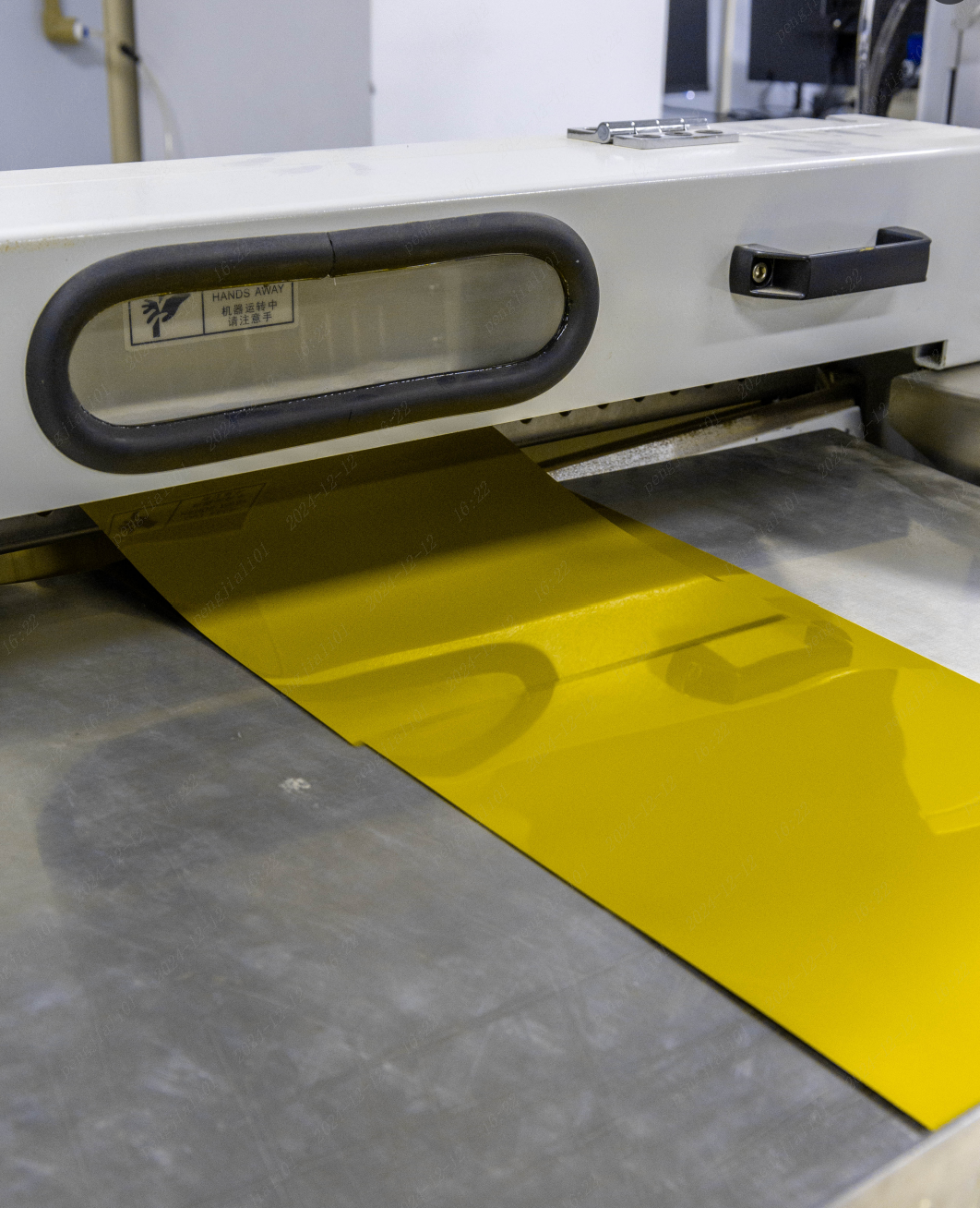根据工程设计要求,利用开料机裁剪出合适尺寸的PI盖膜,为后续的做线路绝缘和发热片成型做准备,需确保尺寸精确。