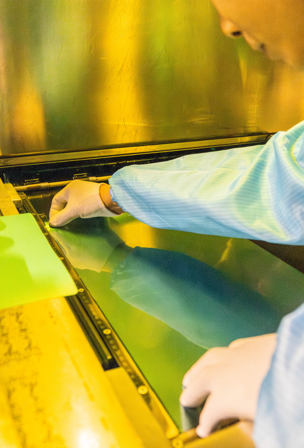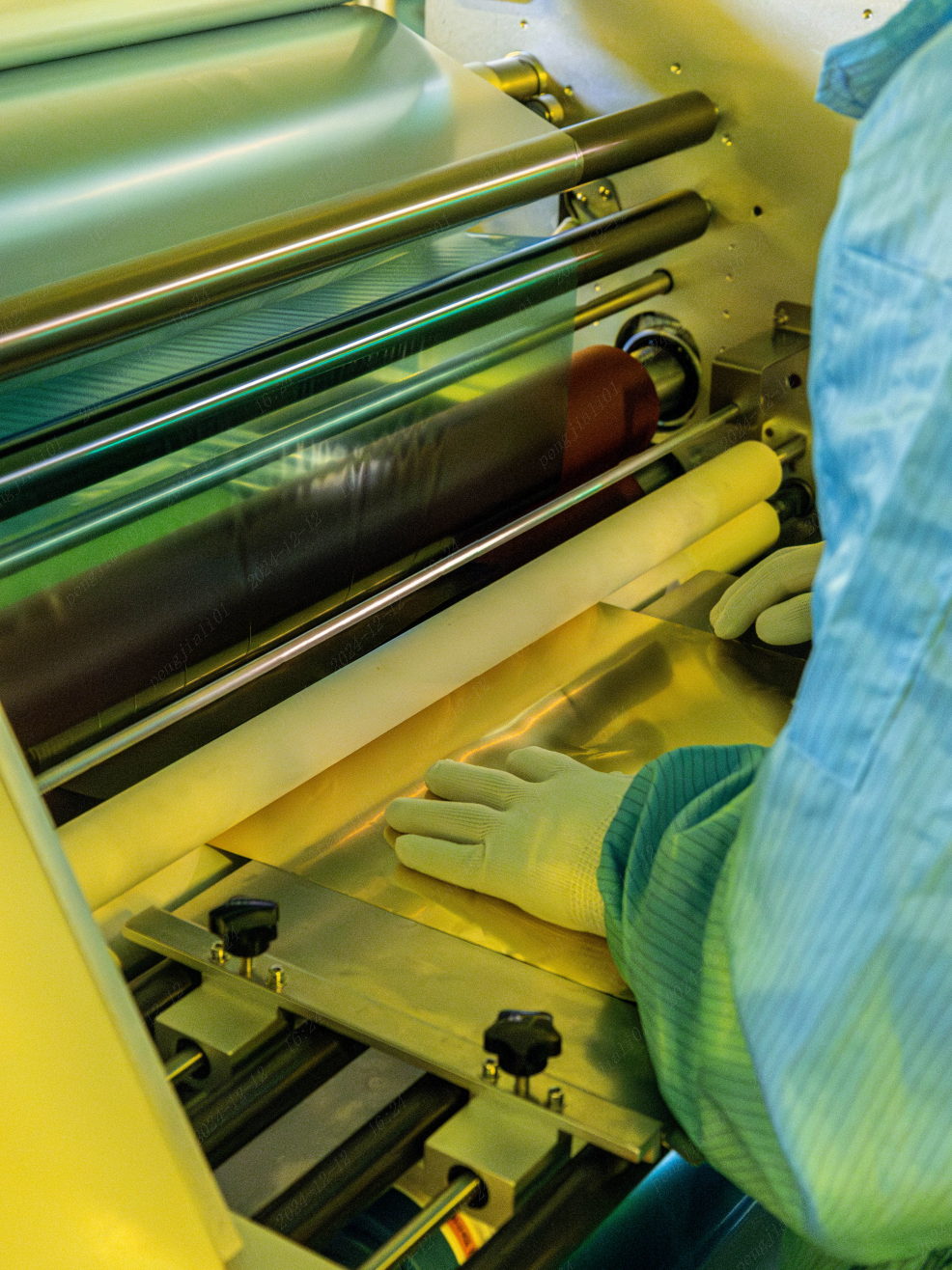 在无尘车间使用覆膜机,在裁剪好的金属基材上覆盖一层干膜。干膜是一种高分子化合物,在后续的曝光过程中起到关键作用。因此干膜的品质和厚度对电热膜的质量和性能有重要影响,需要根据电热膜的具体要求选择合适的干膜材料。
