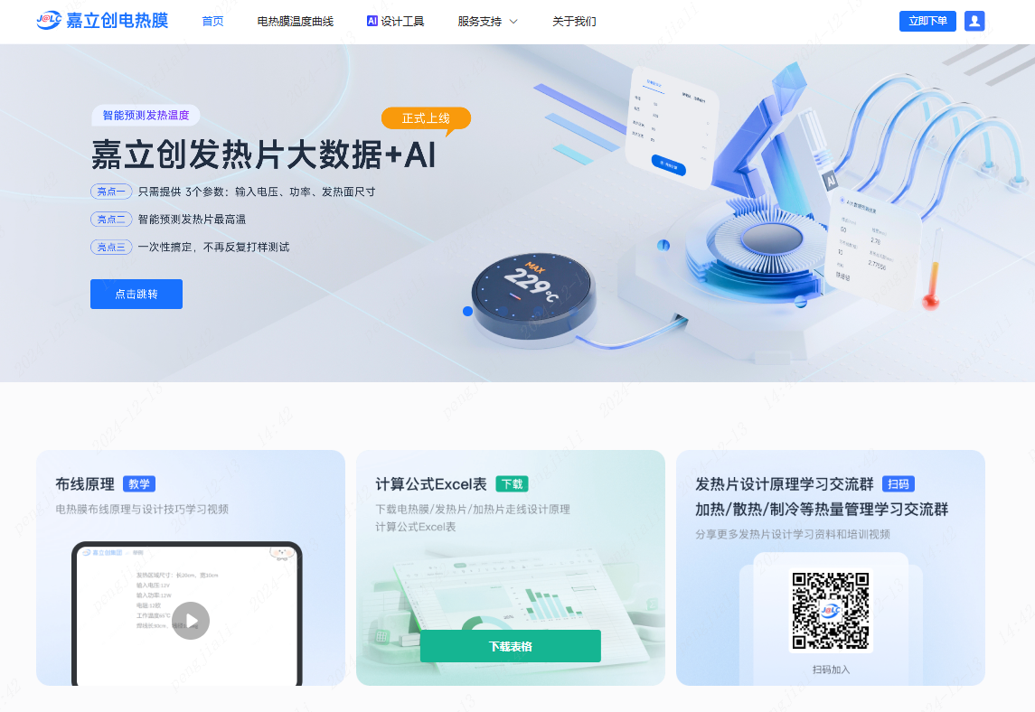 ② 首创发热片行业大数据+AI模型,输入四个参数即可智能预测发热片最高温,一次打样搞定终品,不再需要为一款产品频繁修改设计和打样,节省大量时间成本和经济成本。
