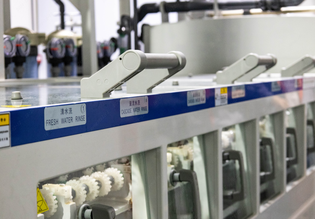 在密轮智能调压调速蚀刻机里,使用化学蚀刻液对显影后的基材进行蚀刻,去除未被干膜覆盖的铜或其他导电材料,保留线路图案。蚀刻过程中,需要控制好蚀刻液浓度和蚀刻速度,确保蚀刻精度。之后再将基材送入具有一定温度的氢氧化钠溶液中,将保护线路图案的干膜去除,显露出线路图案。