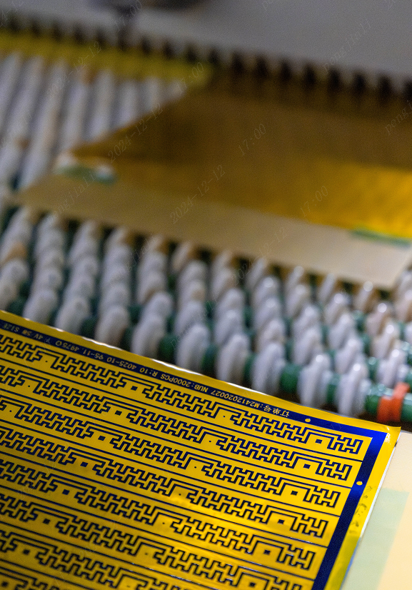 在无尘车间将覆好干膜的基材,放入超大尺寸双台面高精密直接成像曝光系统中,通过双面台结构、大功率混合波长激光光源、多光学引擎扫描技术、实时涨缩管控和分区域失真补偿技术,干膜在经过激光曝光后,产生聚合反应(单体的聚合会影响材料的平均分子量和溶解度),并形成一种稳定的物质覆于基材表面,在线路对应的部位硬化,线路因此被转印到干膜上。