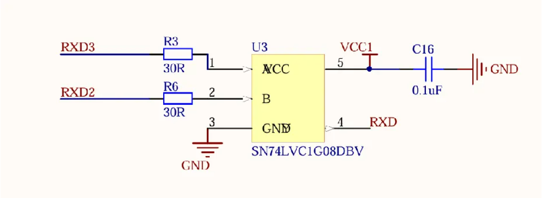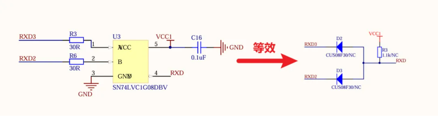 与门部分,也可以使用肖特基做,群友给我寄了两个版本的转换器,其中的一个使用的是肖特基搭建的双输入与门,也是为了消耗自己手头肖特基二极管的库存,也是蛮巧妙的。 当 RX 3和RX2其中有一个为0时,RXD输出为d低电平。 原理图如下所示: