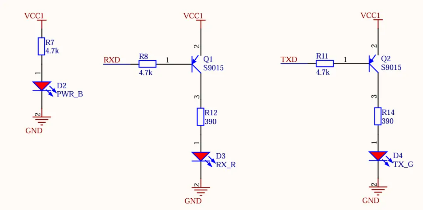 指示灯部分电路如下所示,使用三极管间接控制LED灯。