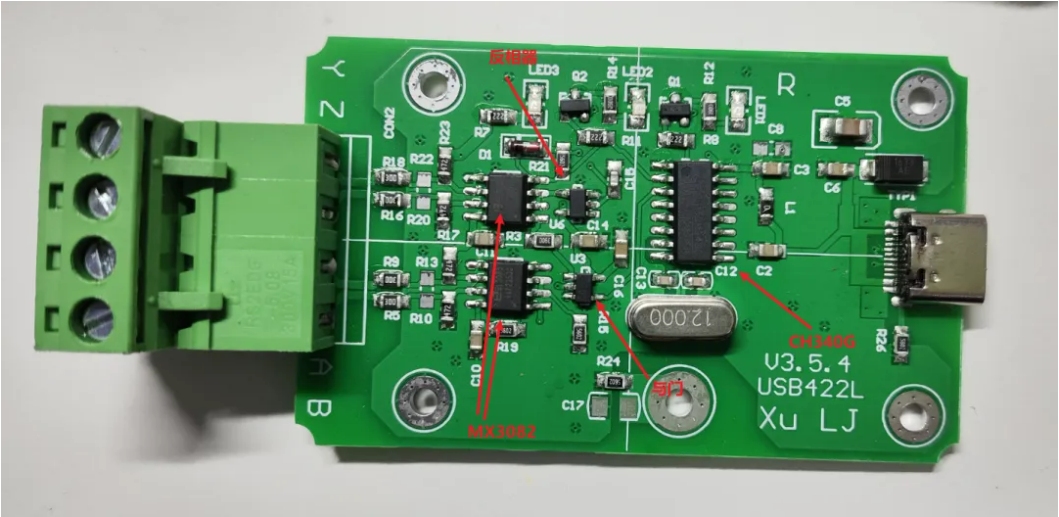 拆开,可以看到设计大致如下所示,有两颗MX3082作为485/422的收发芯片,USB转串口使用了一颗CH340G。