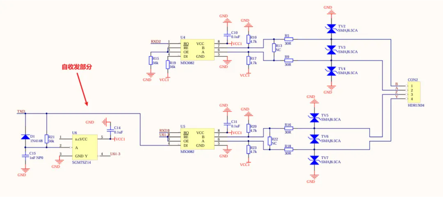 主要的自收发部分和RS485/422部分的电路如下所示,两个485的芯片的RO使用与门与到了一起,这样就实现了RS422与485的兼容: