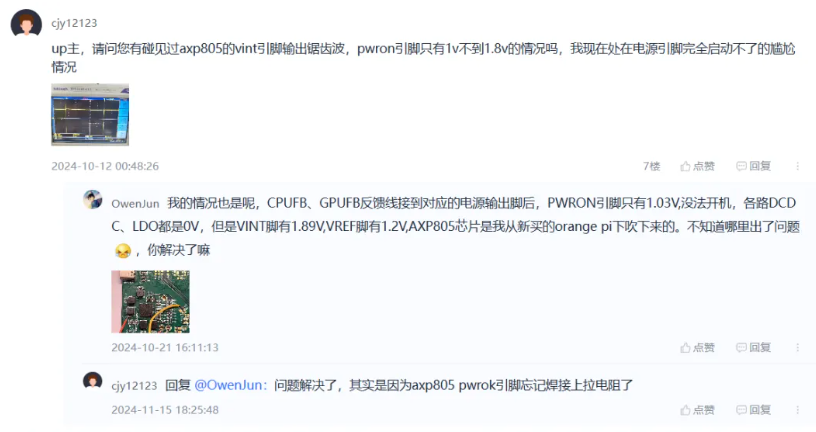 PCB检查完毕后,就可以进行焊接了。先从PMIC电源开始焊接,这里提醒一下,有一个小坑,当所有的PMIC元器件焊接完之后,会发现,电源工作不起来,没有电压输出,但是把芯片做交叉验证,拿到我买的Orange Pi上面焊接完后又是好的,因此芯片其实是好的,经检查后发现有一个小电阻忘记焊接了,axp805 pwrok引脚这颗上拉电阻R10不焊接,电源就不能正常工作。看PCB的位置,这颗电阻距离PMIC芯片是真的远。