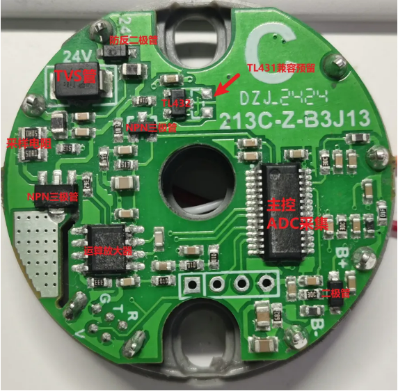 不过其实仔细观察以及万用表测量也可以大致看出主要的芯片功能,应该如下所示,主要由MCU,运放,三极管,432基准源等组成。