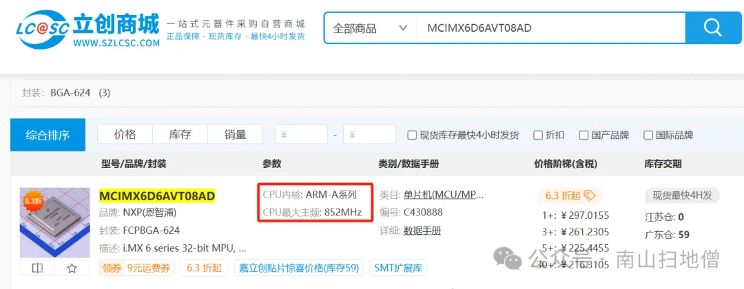 紧接着就是板子的正面,也很豪华,主芯片MCIMX6D6AVT08AD,封装FCPBGA-624,直接在立创商城上一搜,芯片规格书就出来,如下所示: