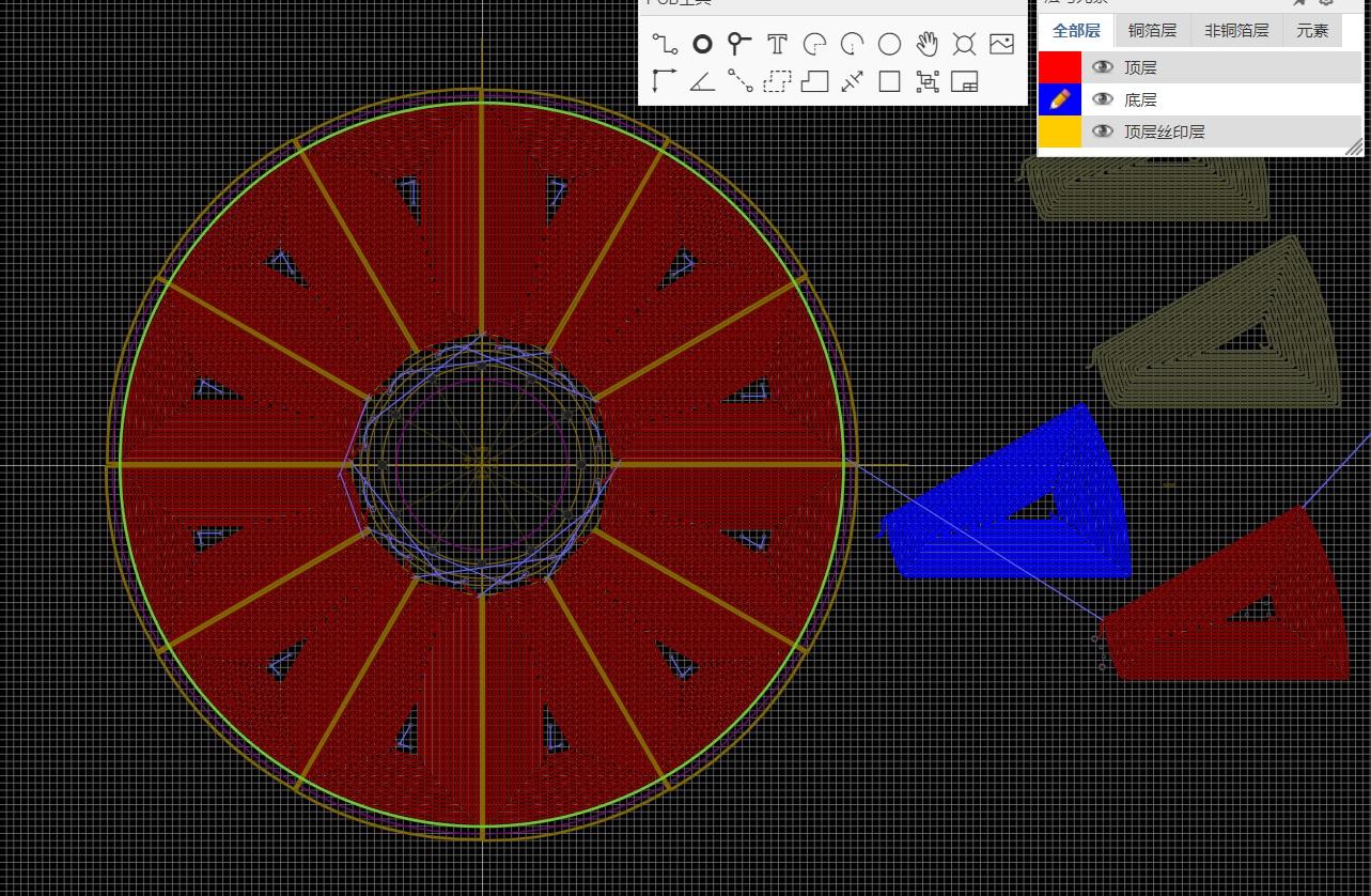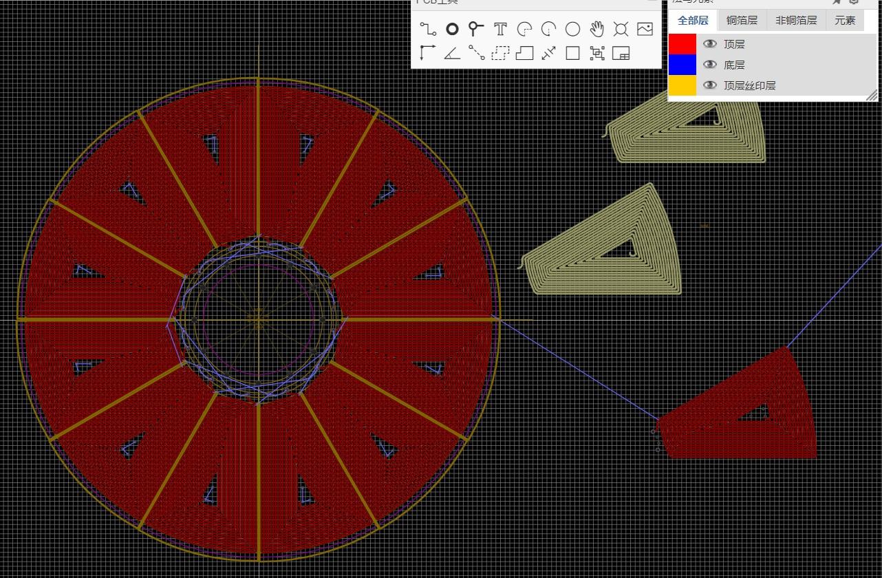 我想做一块PCB电机板,PCB板每层做12个线圈。我想只画一个线圈,后面的线圈直接复制粘贴。今天做好了顶层的线圈,然后把线圈复制到第一层和底层。形状没有镜像180°翻转,根据以前画两层板的经验,元件焊盘从顶层改到底层会做180°镜像翻转。业余爱好者以前只做过几次双层板,这是第一次画6层板有几个疑问想请教大家。
