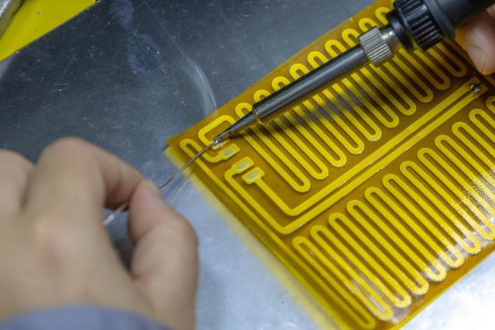 利用柔性板高温高压快速压合机在高温下对多层材料进行压合,通过高温高压,使覆盖膜的胶黏剂完全融合固化,与线路基板成为一体,形成坚固的发热片结构,提高产品的耐用性。