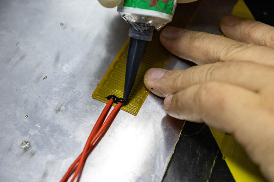 在发热片的开口处打上硅胶,进行密封处理,同样是增加焊盘的牢固度,绝缘和防水作用。