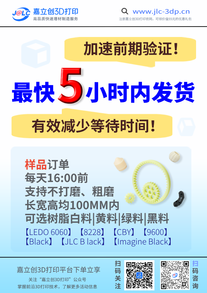 如果您的产品前期验证需求非常紧急,装配物料推荐您选择嘉立创3D打印!嘉立创3D打印拥有大规模的自有工业级3D打印机,全部采用数字化全流程管理模式,支持全天24小时不间断接单和生产,能够快速生产打印高质量产品,以此确保交期稳定性。这将有助于您高效完成产品的设计验证,加快产品迭代的速度。客户可以在嘉立创3D打印实现当日下单、当日发货,支付完成后最快5小时即可发货!关注嘉立创3D打印官方动态,了解更多活动信息。#3D打印# #嘉立创3D打印# #DIY设计#