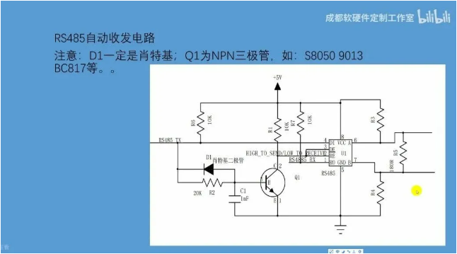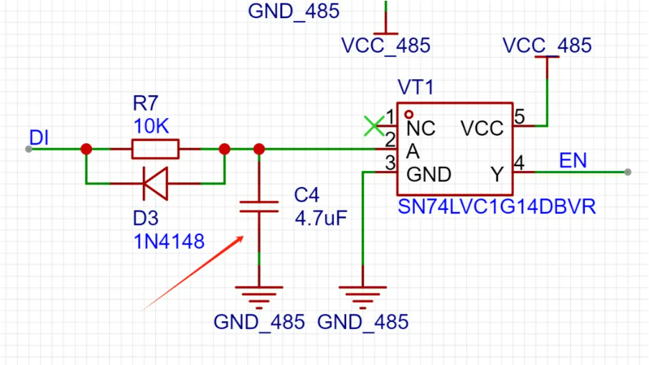 而有这个电容的存在,就可以在DI由低电平到高电平跳变的时候(串口的起始位为低电平),给电容充电到反相器的输入阈值判断为高电平之前,让RS485芯片处于发送状态。从而可以让芯片的管脚输出A高电平,B低电平(而不是靠上下拉电阻,这很重要)。