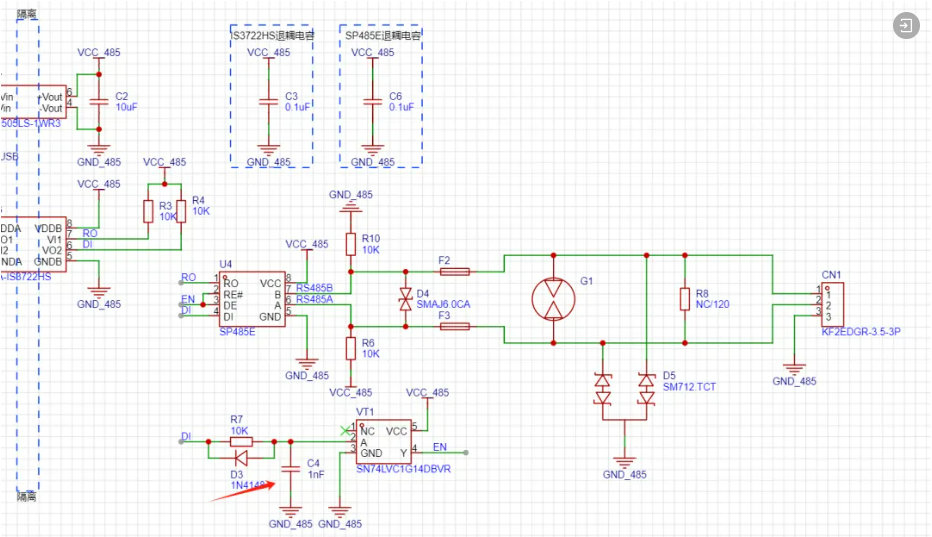 例如我把这个板子的电容C改为4.7uf,那么RC变大了,以至于发送完之后芯片还能持续20ms的发送状态,而如果在发送完之后还为发送状态的情况下,从机已经开始回复信息了,那么RS485芯片就接收不到,所以要综合考虑。