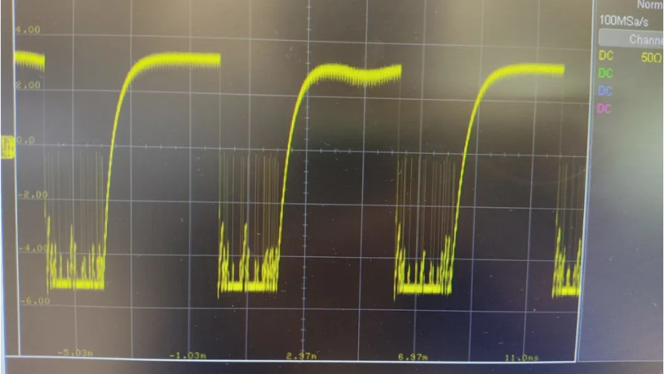 这种设计相比不带电容,而是直接用反相器控制的好很多,因为 如果直接接反相器(有的用三极管),那么这个电路在DI等于1时,A和B都为高阻态,那么这个电路的驱动能力就完全由上下拉电阻的大小去决定,在线缆长的时候(下图为300米测试)就无法输出驱动的高电平 ,大致如下图:
