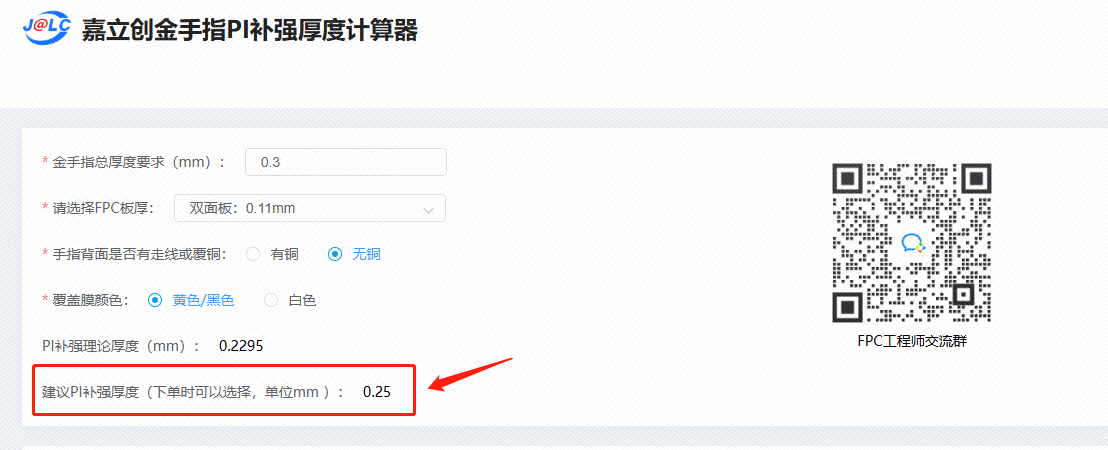 只需要输入金手指总厚度,即可自动计算出PI补强厚度
