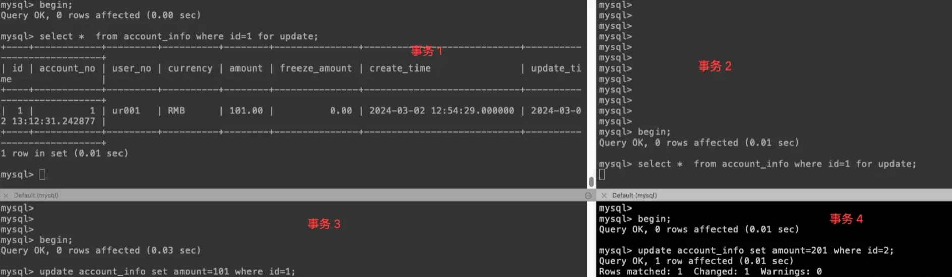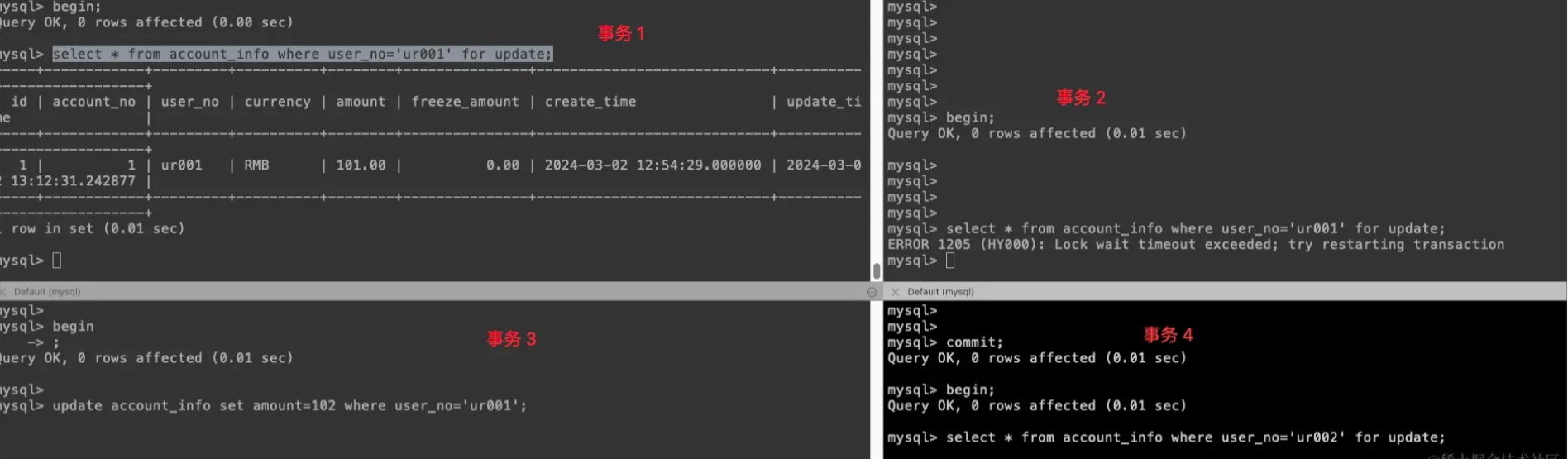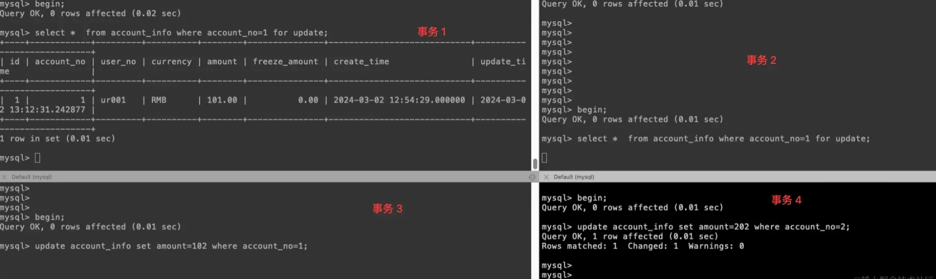 创建一个账户表,插入基础数据,以唯一索引、普通索引、主键、普通字段4 个维度进行select ... for update查询,查看是进行锁表还是锁行