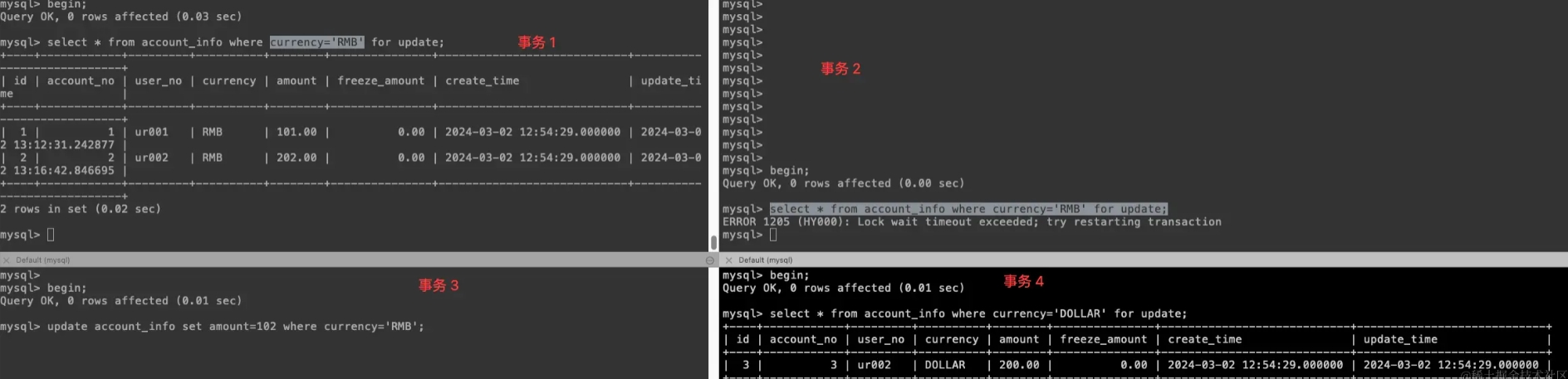在事务 1 中,根据普通索引currency='RMB' 进行 for update查询时,事务2、事务 3 都进行阻塞,而事务 4 由于更新的currency='DOLLAR`所以成功,因此判定,根据普通索引进行 for update 查询时是行锁