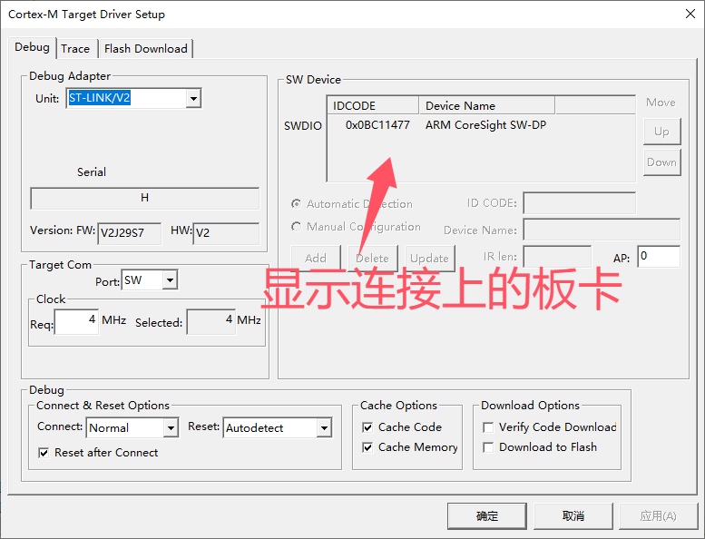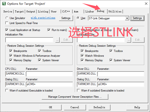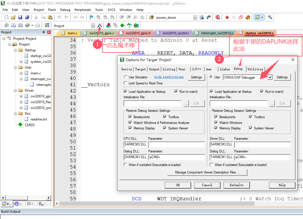 点击DEBUG配置下载器,如果你是DAPLINK就选择DAPLINK选项,如果你是STLINK就要选择STLINK,如图: