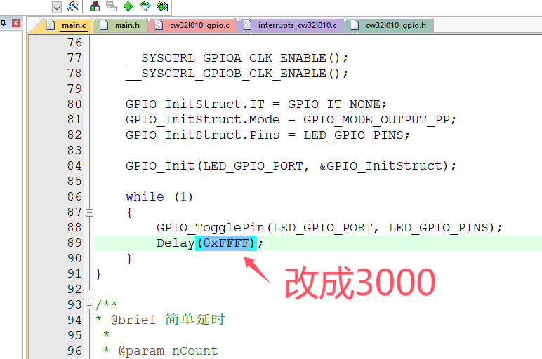 修改程序,一个是引脚号,程序里是PB2,原理图是PB0,所以把2改成0,另一处是延时函数那里,把0xffff改成300000,延时大概0.2秒闪烁。