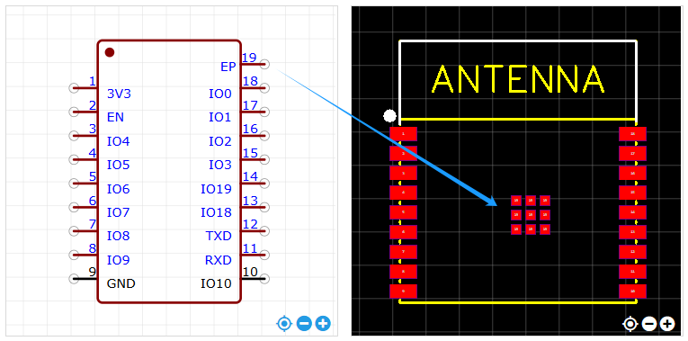 EP焊盘是常用于扇热和接地的焊盘设计定义,常见于中高功耗模组,和对内封晶圆有极大散热需求的芯片。如下图EP--19PIN,是指ESP32模组中部用于连接地和提高模组散热能力。