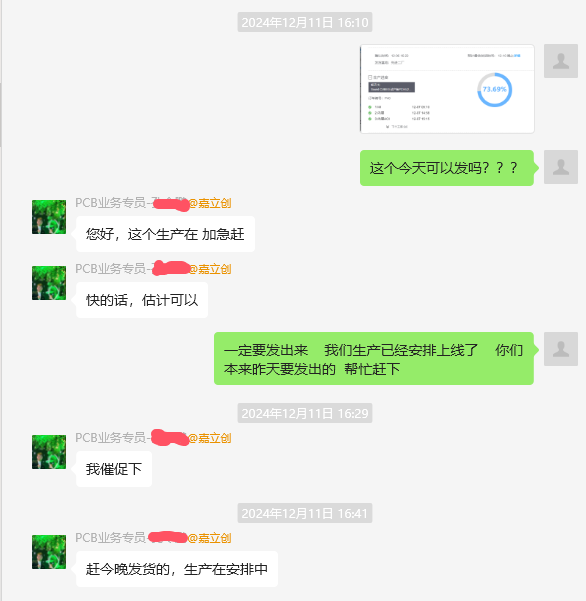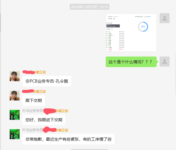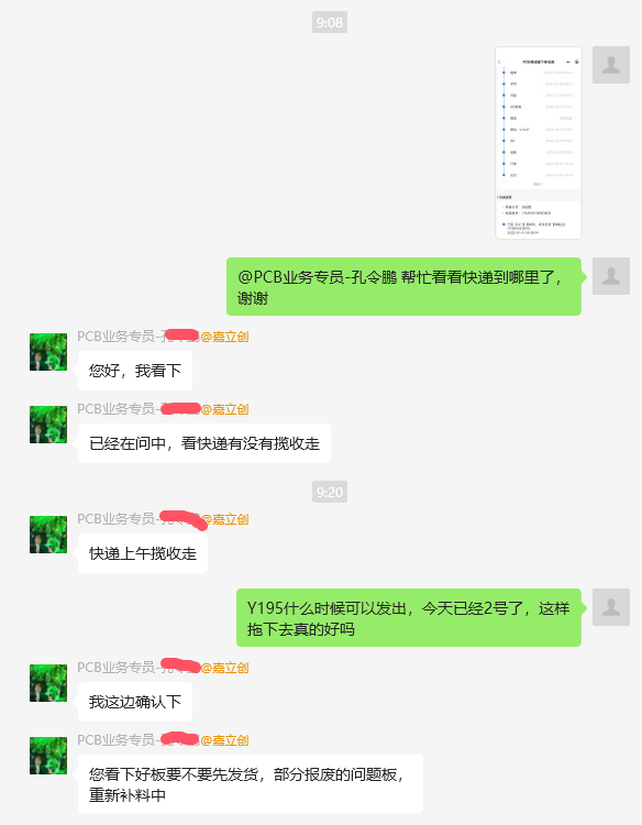 #嘉立创PCB#你们推迟交货的理由从开始的“我们会催生产会更进。。。到我们最近生产很忙,有的工序慢了点。。。。到有部分报废板要重新补料做。。。。。到现在的假发货状态。。。。。。。 ”。
