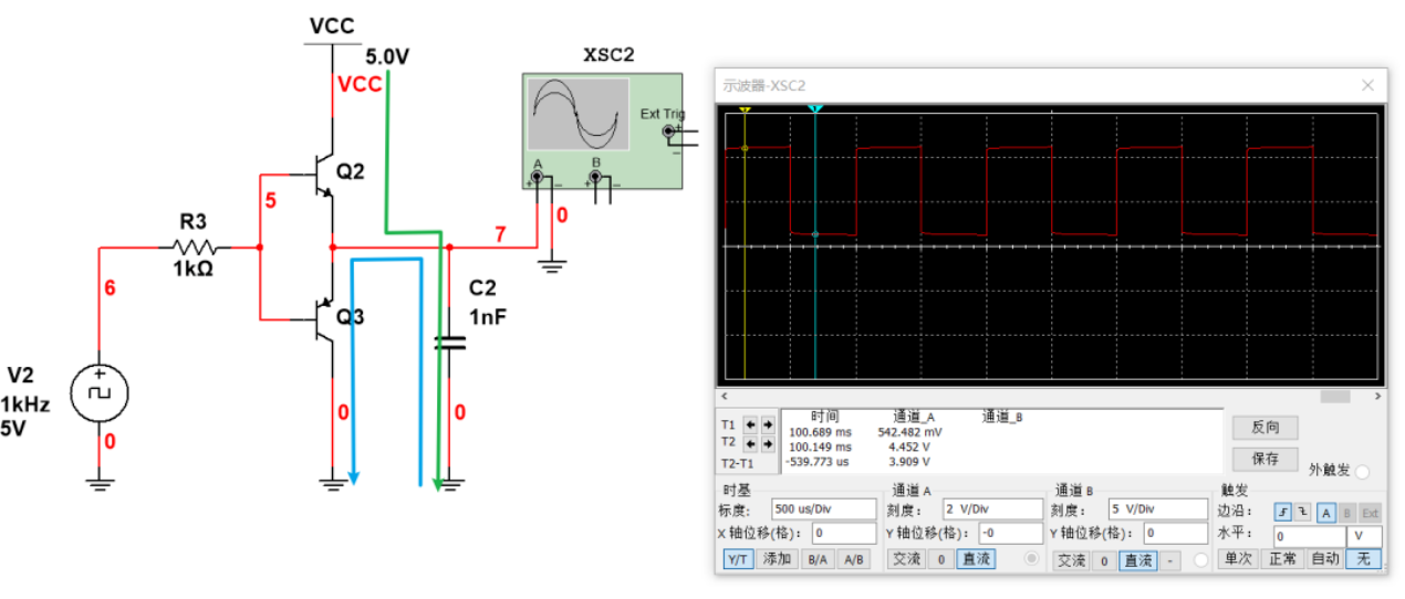 那么和之前一样,如果在输出端加一个1nf的电容(模拟线缆寄生参数)会怎样呢?当V(6)为高电平时,上管Q2导通,下管Q1截止,通过绿色路径给电容快速充电;当V(6)为低电平时,下管Q1导通,上管Q2截止,通过蓝色路径给电容快速放电。可以看到这个结构并不像之前上升沿会变缓,而是几乎没什么影响。