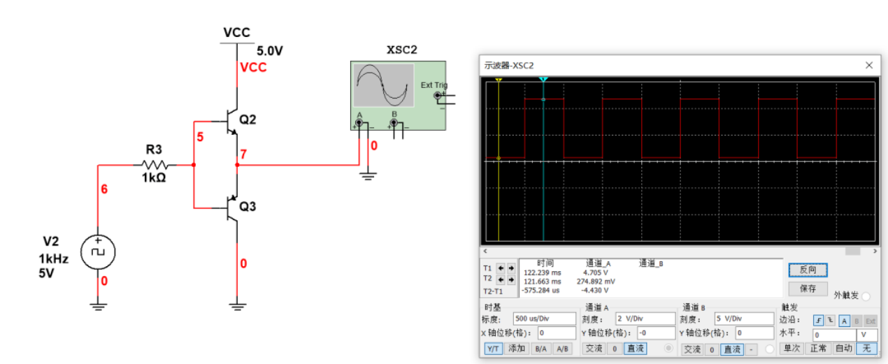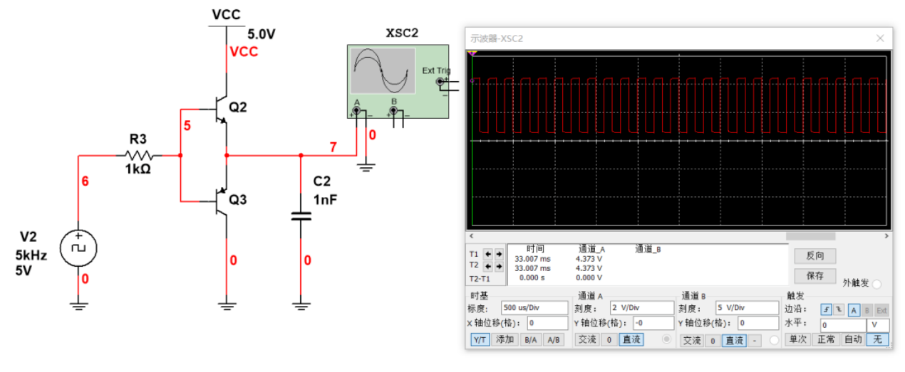 可以看到这个电路也是可以输出方波的,但是有没有注意到他的高电平并不是5V而是4.7V,且低电平也不是0V而是0.3V?那是因为在V(7)电压变为4.7V左右的时候,上管Q2就截止了;在V(7)电压变为0.3V左右的时候,下管Q3就截止了。(oc门结构中,低电平也不是0V,而是Vce三极管的饱和电压)