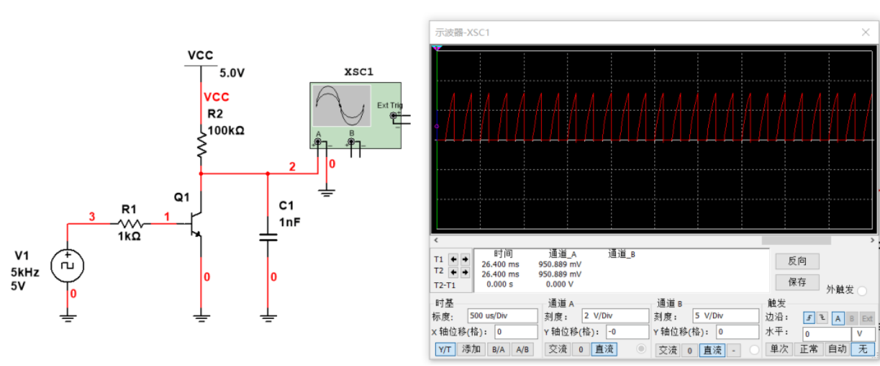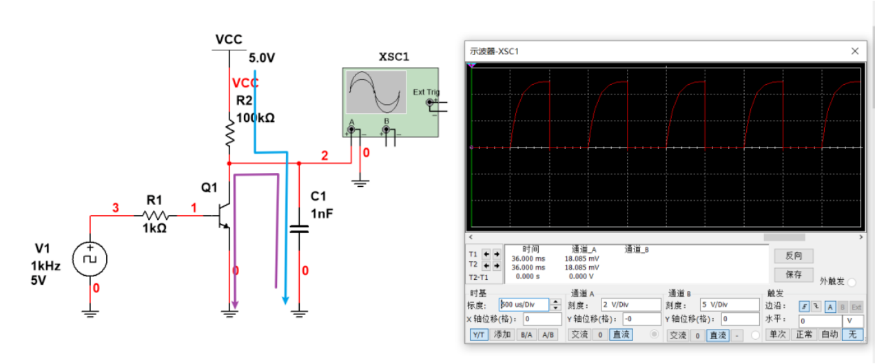 可以看到上升沿变得很缓慢,因为在三极管截止时,上升沿的爬升,是通过蓝色路径,通过R2上拉电阻去给电容充电的,所以上升沿变得极其缓慢。但是三极管导通时,是通过三极管直接进行放电的,所以下降沿不是很缓慢的。