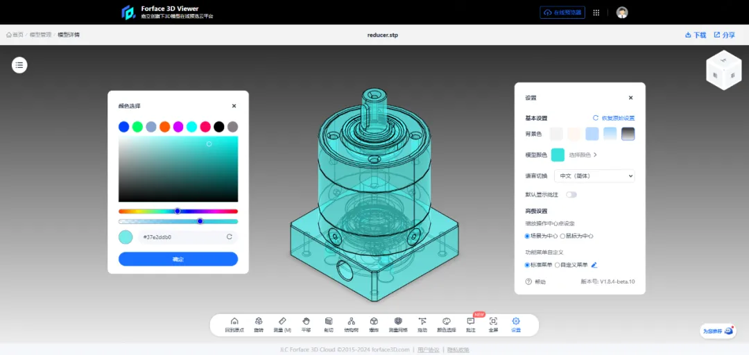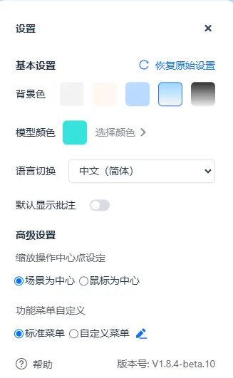 背景初始默认为灰色,目前支持五种背景色进行设置,设置后,打开其他模型都会优先展示设置的背景