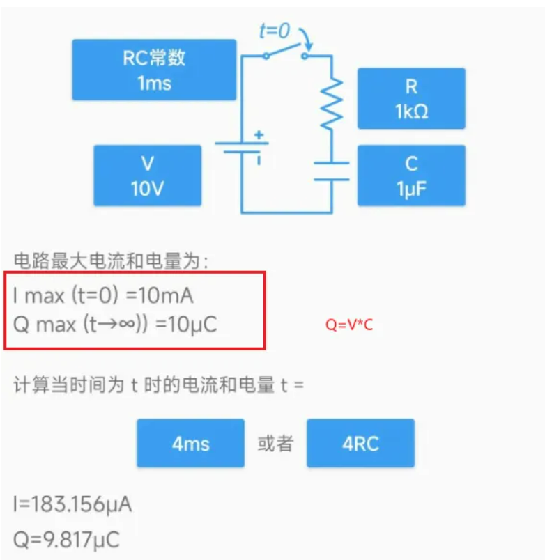 所以可以认为 3个时间常数电容就基本充满了(95%) ,而且在 上电瞬间,电容等效为短路,此时电流最大,等效为V1/R1。随着时间的增加,电容上的电压越来越高,充电电流越来越小,t趋向于无穷的时候,电流趋向于0。 下图工具里的计算器也可以计算。
