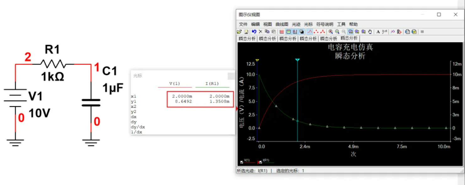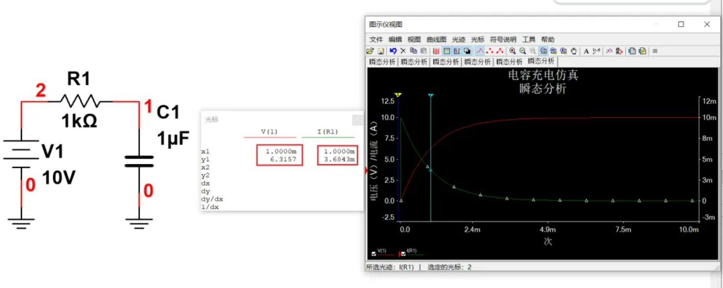 1个时间常数1ms的时间,电容电压充到63%,前半段电容的充电电流还是很大的,此时反推回去1τ下的充电电流为0.37*V1/R1。 绿色的为电容的充电电 流曲线,红色的为电容的充电电压曲线。