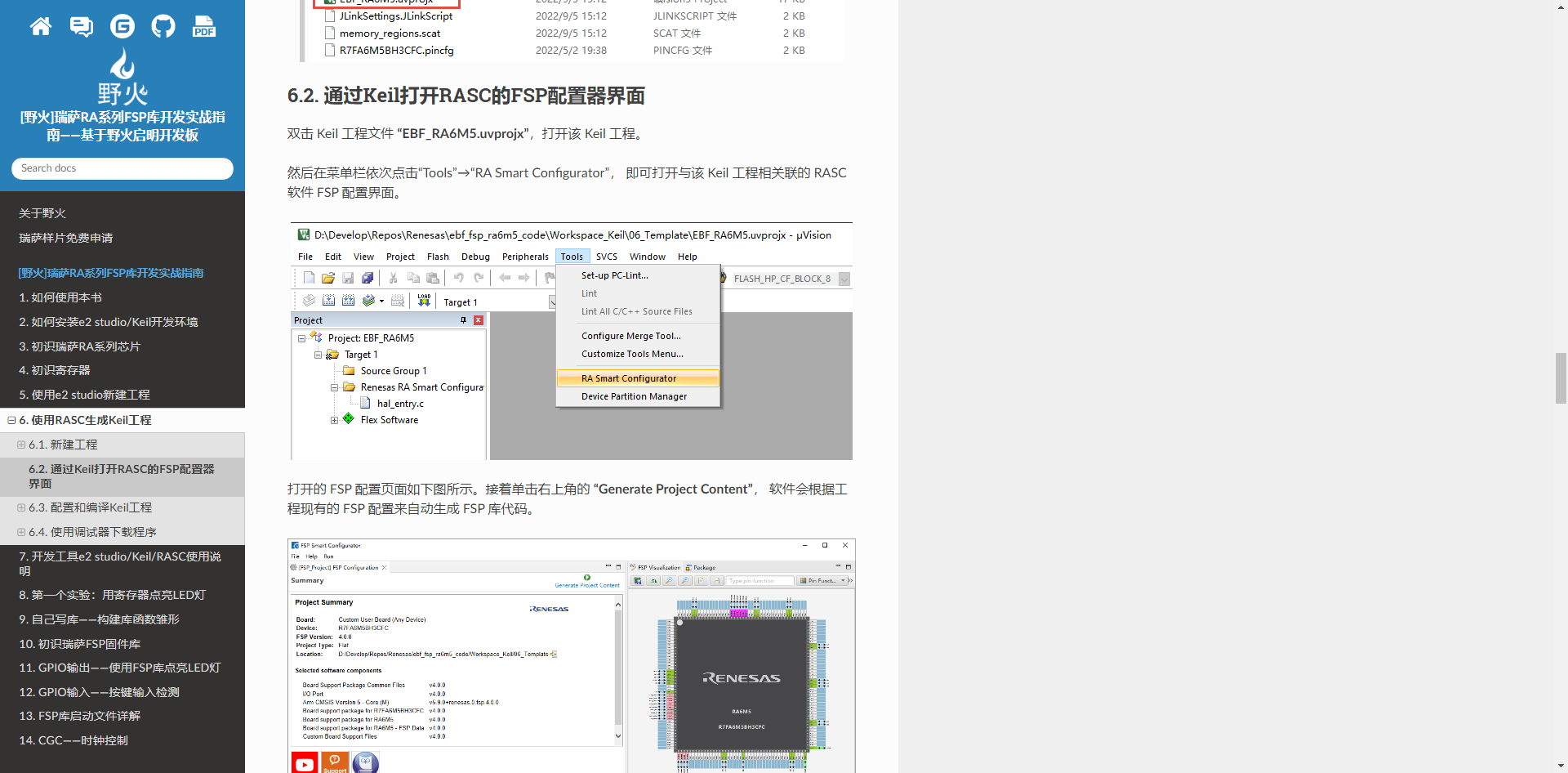 4.野火的这个开发板也可以参考 https://doc.embedfire.com/mcu/renesas/fsp_ra/zh/latest/doc/chapter6/chapter6.html#keilrascfsp