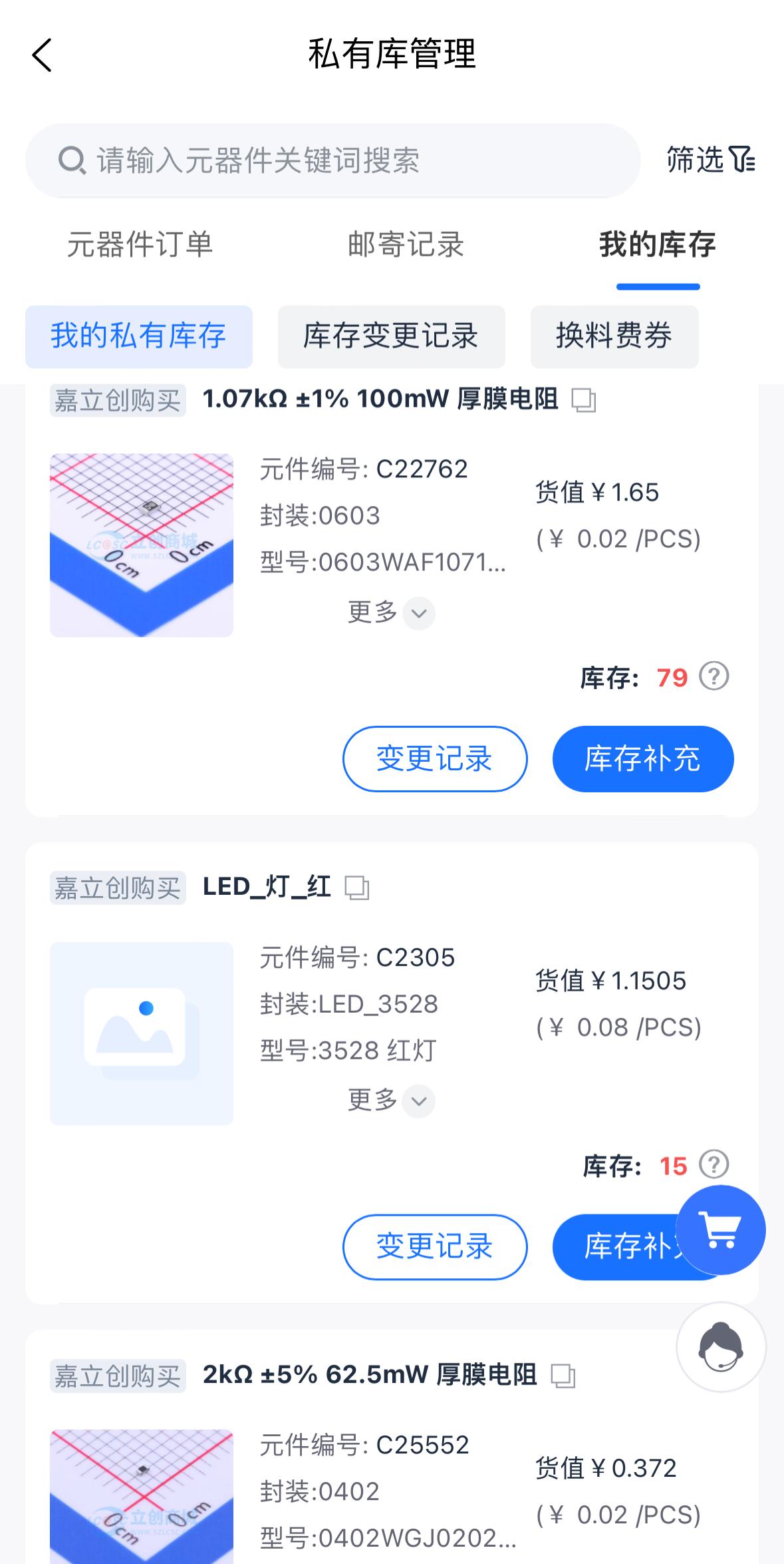 购买到私有库的元器件可点击进入“私有库”,进行私有库存管理、查询私有库变更记录,查看换料费券等操作。