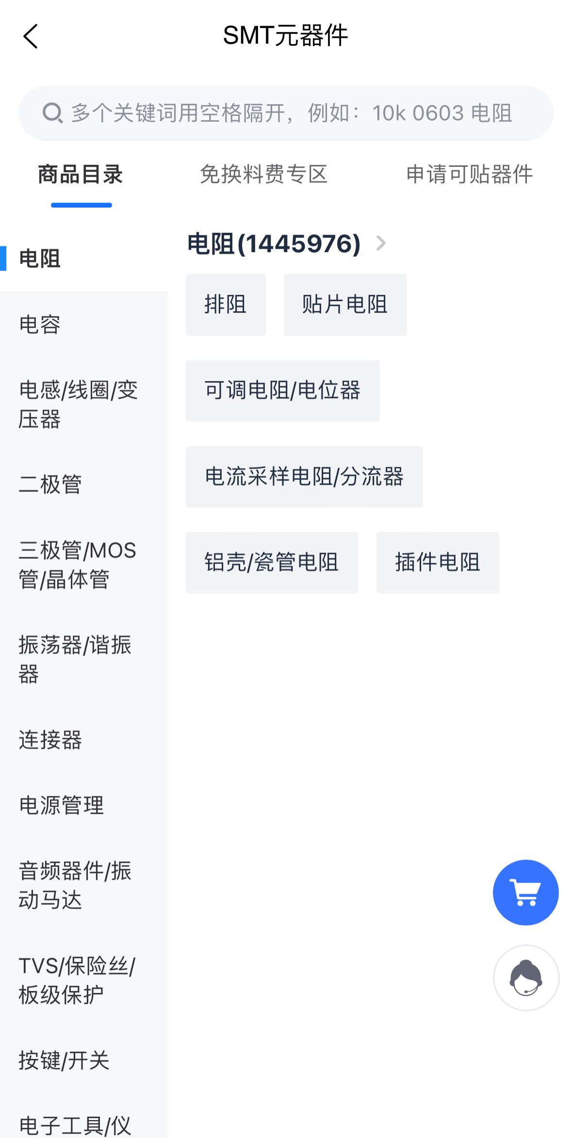 在PCBA 服务页面点击“元器件”进入SMT元器件界面,可根据您自身的需求精准查询元器件。