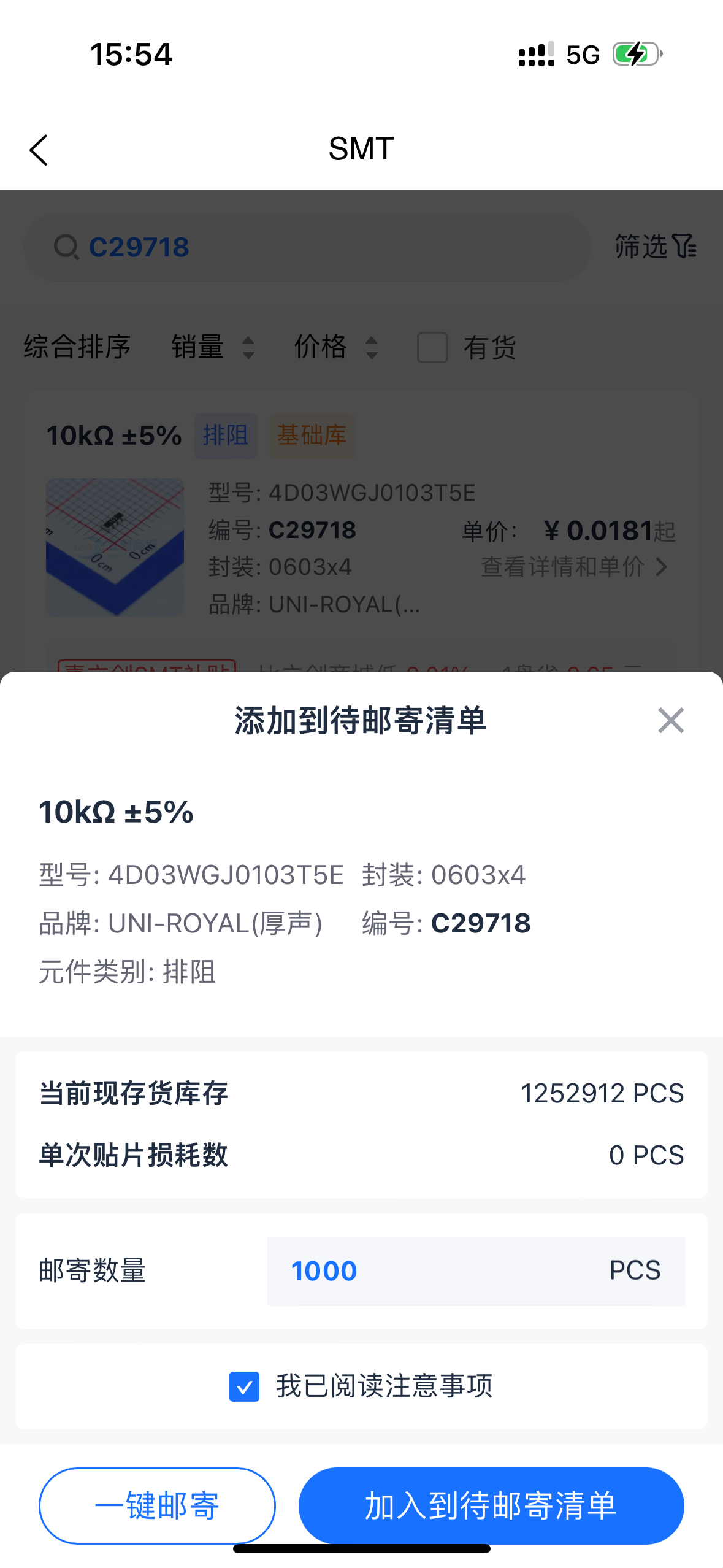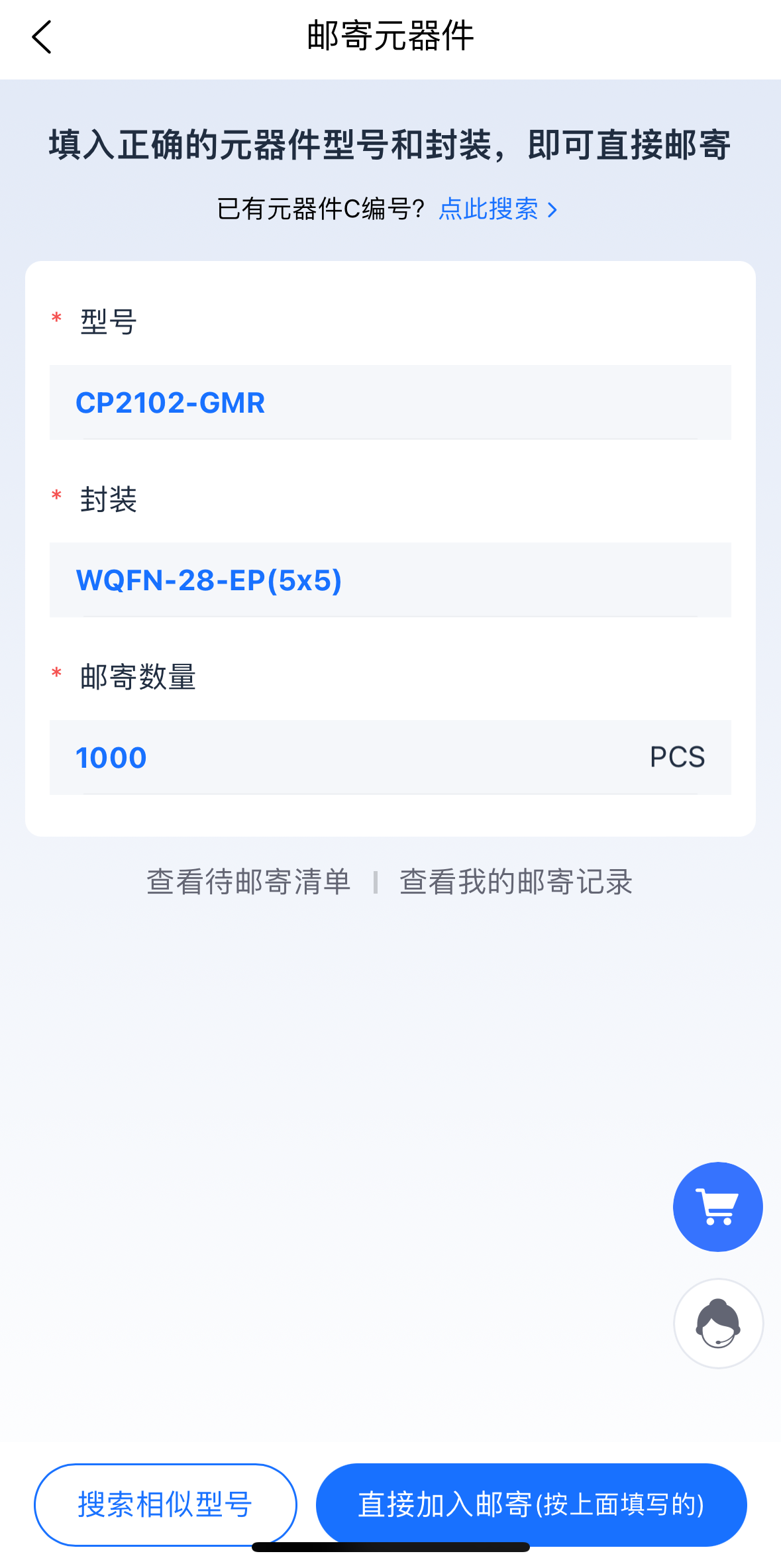 查询到您所需要邮寄的元器件,点击“我要邮寄”并填写邮寄数量后即可将其加入待邮寄清单。