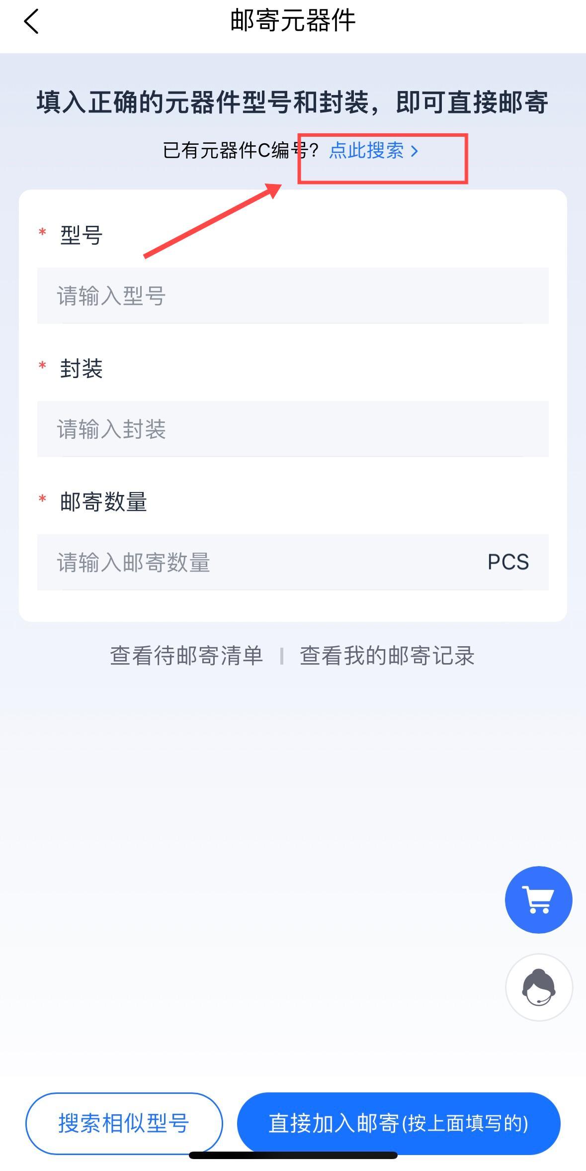 邮寄已有C编号的元器件,点击搜索框可查找您所需要邮寄的C编号元器件。