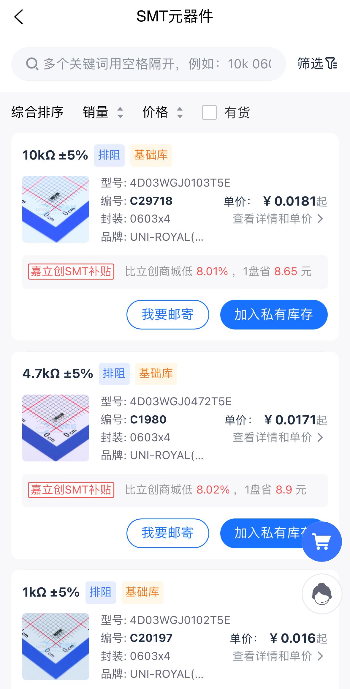 03支持一键查询元器件,管理私有库存:在移动端也可以查询元器件,一键购买到您的私有库存供后续贴片用。