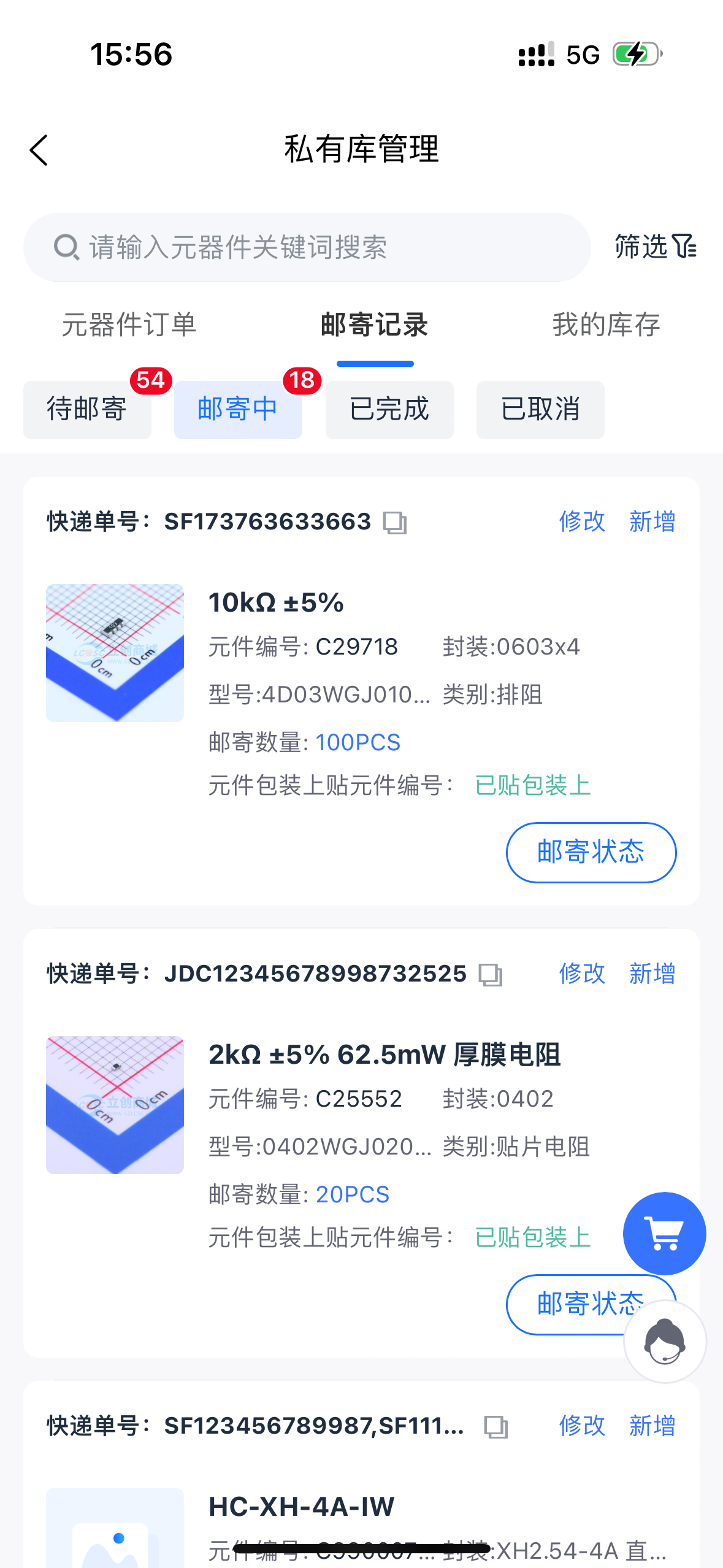 02支持一键邮寄元器件:无论何时何地,只需一部移动设备即可一键添加您需要邮寄到嘉立创的物料,轻松查看邮寄记录、管理库存。