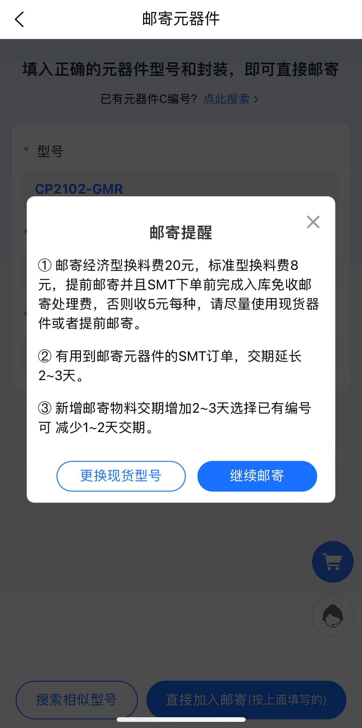 确认邮寄提醒后,即可将需要邮寄的元器件加入到待邮寄物料中,后续可在邮寄记录中查看待邮寄的元器件。