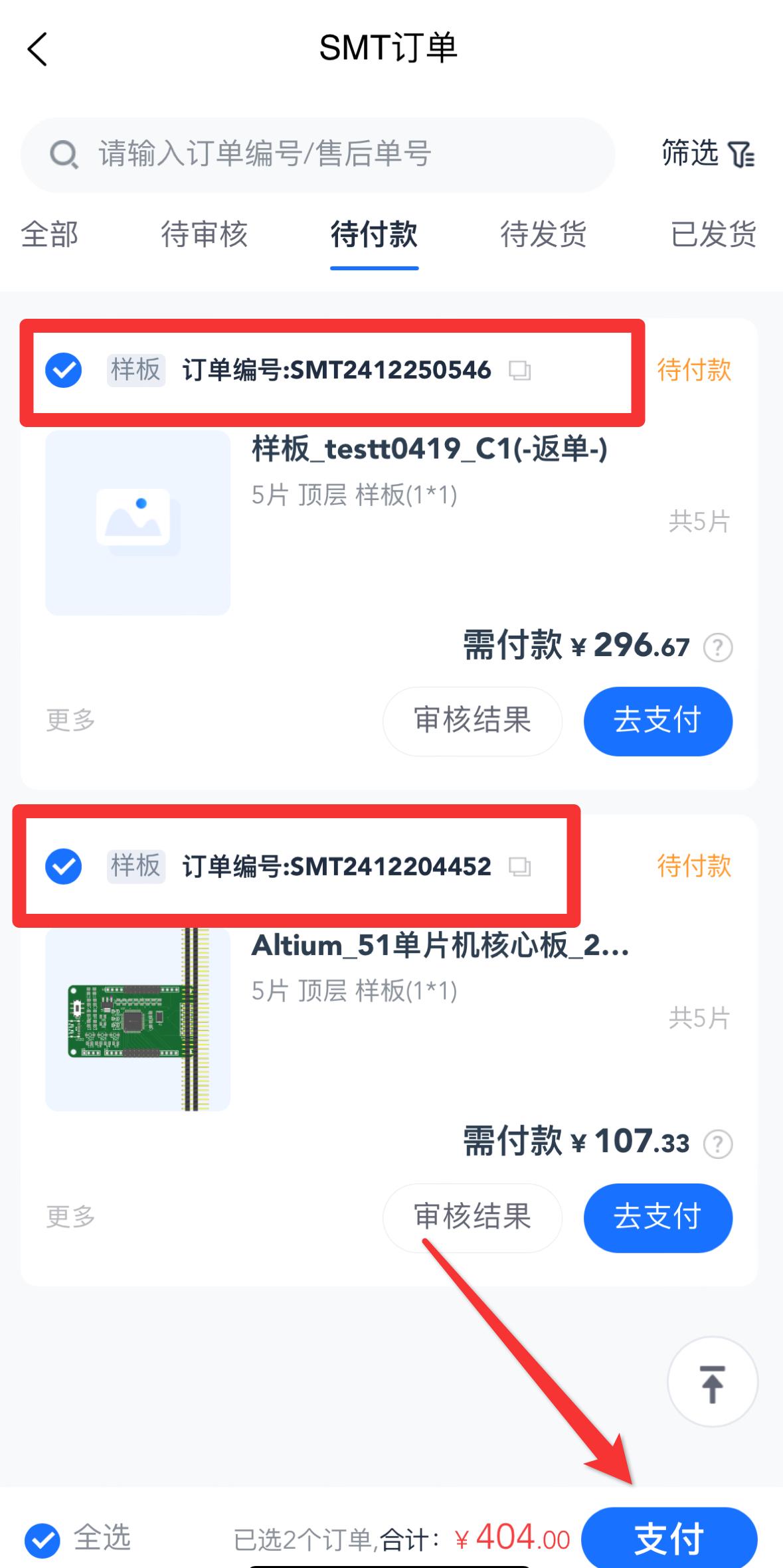 点击“待付款”可查看所有待付款的SMT订单,支持一键勾选,合并支付,轻松搞定所有待付。