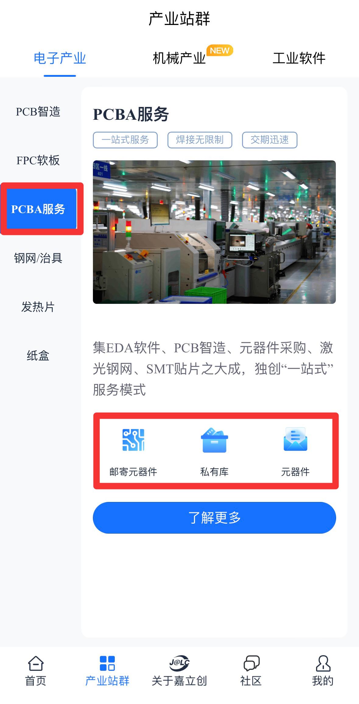 进入产业站群中的电子产业板块,找到 PCBA 服务页面。在此页面,您可根据自身需求选择邮寄元器件、查询元器件或者管理私有库。