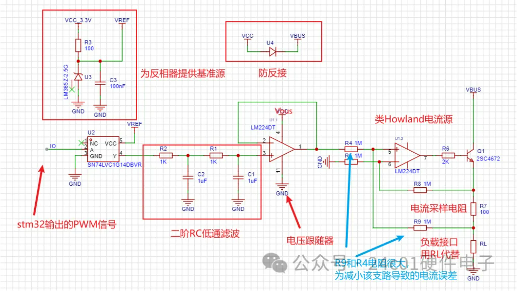 单片机IO输出不同占空比的PWM,LM385为反相器提供基准电压,可以让反相器输出的PWM中携带的直流分量更精准;然后反相器输出后的PWM经过2阶RC低通滤波后接一个电压跟随器,减小RC低通滤波器的输出阻抗,防止对后级Howland电流源中的反馈造成误差。