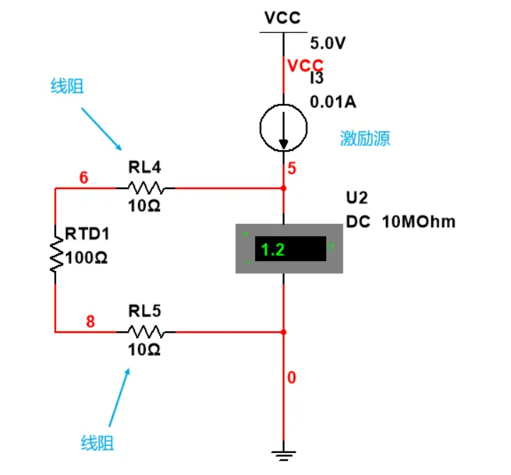 那么RTD就可以根据激励电流的值以及测量电压的值计算出来,以此降低引线电阻带来的误差。