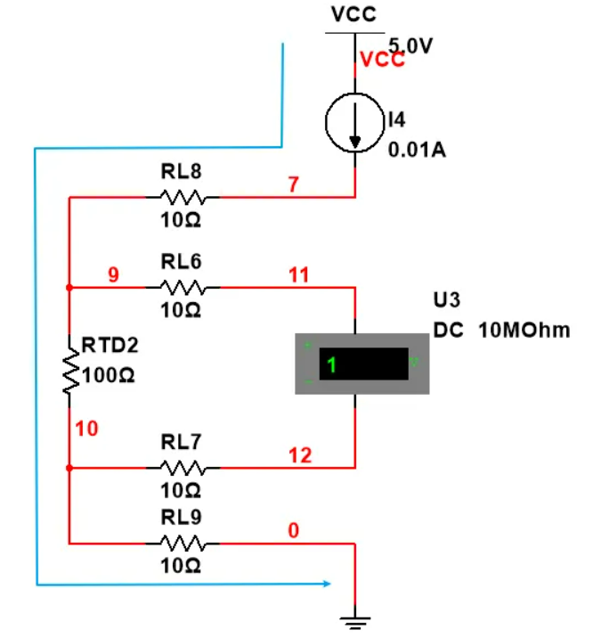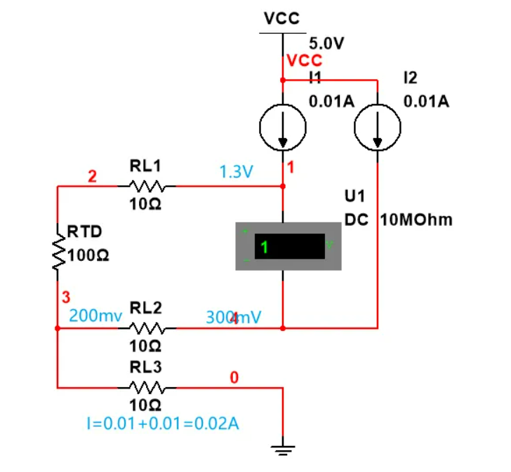 三线法测RTD电阻仿真如下,节点电压已标记出。(需要注意的是,如果I1和I2不一样,以及RL1和RL2不一致,均会引入误差。)